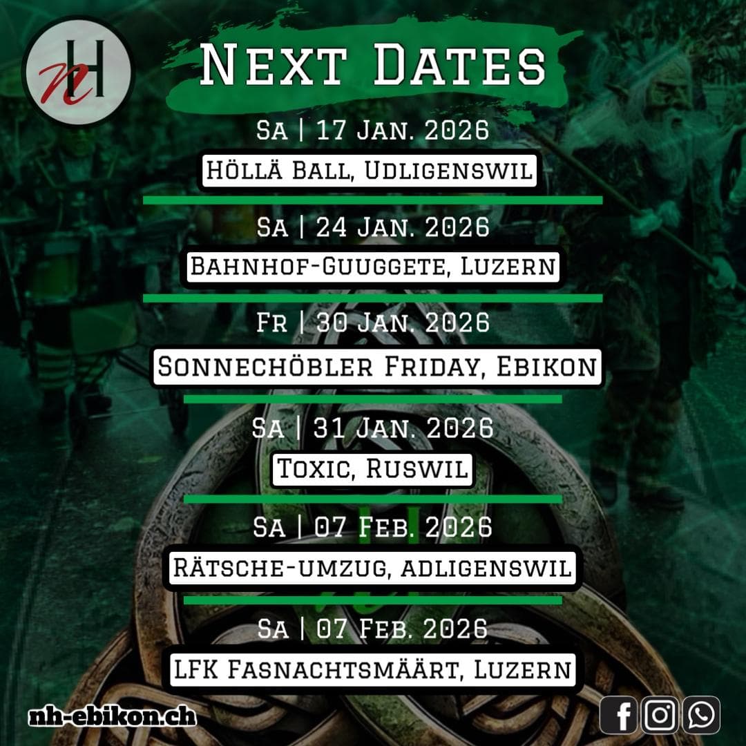 Wir freuen uns auf eine rüüdig verreckte Fasnacht und hoffen, dich bei einem unserer Auftritte begrüssen zu dürfen!